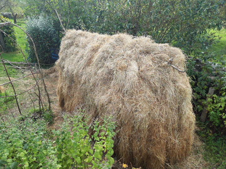 Starting with twisted hazel stapes to hold the large stems down to the ground, we then augered holes and inserted the uprights as stakes, bent over at the top to meet their opposite partners and secured with ivy twisted into string.  Casting around for found materials on the farm, we lighted on the hay bales stored in the nearby barn, which provided a thick thatch for the building.